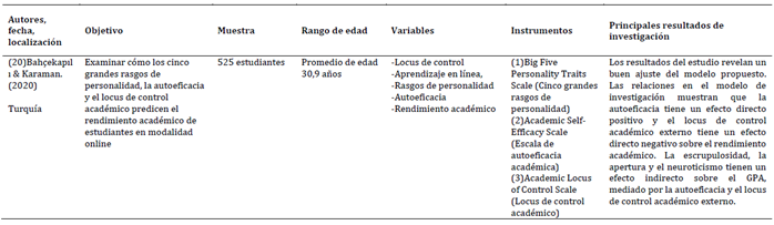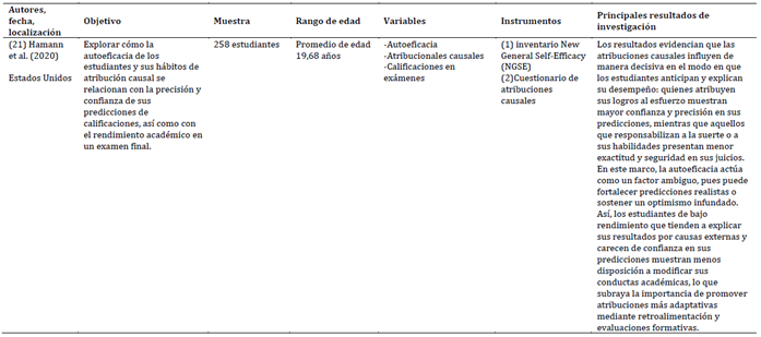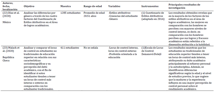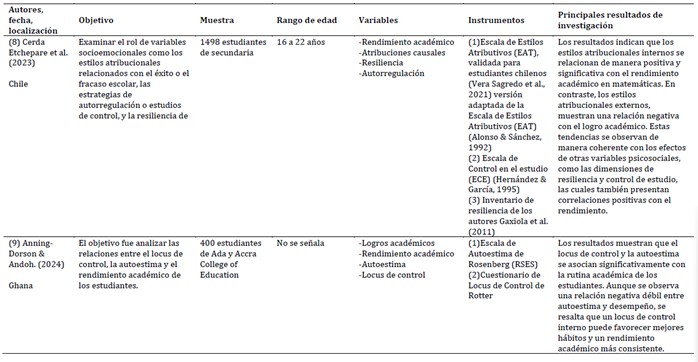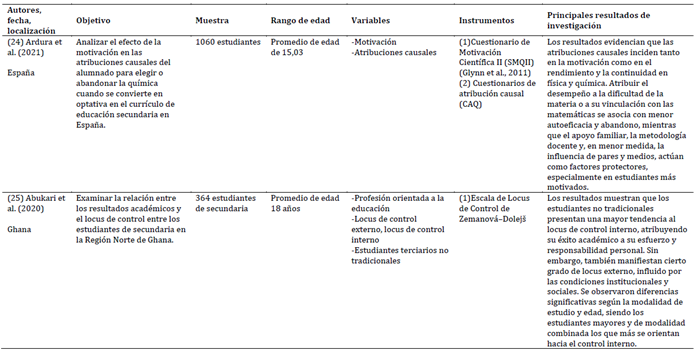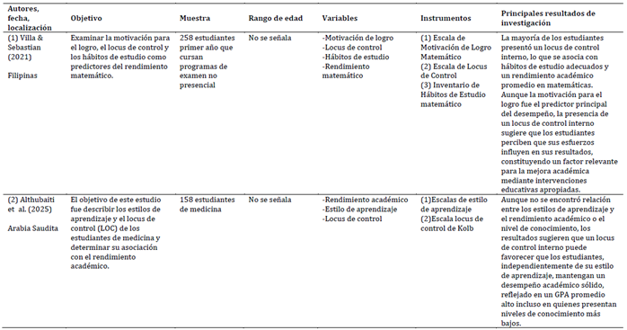 Las investigaciones incluidas en la revisión abarcan contextos educativos diversos y presentan una amplia variabilidad en tamaño de muestra y rango etario, lo que permite una evaluación comprensiva de las atribuciones causales, en específico, el locus de control. Las muestras oscilaron desde grupos reducidos de menos de 100 participantes (Damerau et al., 2021; Kim & Lanzl, 2021) hasta cohortes de más de 5.000 estudiantes (Szabó-Morvai & Kiss, 2023), incluyendo estudiantes de educación básica, secundaria y superior. Destacan poblaciones específicas como 104 estudiantes de Pedagogía en Educación Física y Salud en Chile (Vera-Sagredo et al., 2024), 158 estudiantes de medicina en Arabia Saudita (Althubaiti et al., 2025) y 258 estudiantes de programas no presenciales en Filipinas (Villa & Sebastian, 2021). En conjunto, las 27 muestras suman 17.752 participantes, con edades que van desde la infancia y adolescencia hasta la adultez joven, lo que proporciona un marco amplio y representativo para analizar la influencia del locus de control sobre el rendimiento académico en distintos contextos culturales y educativos.