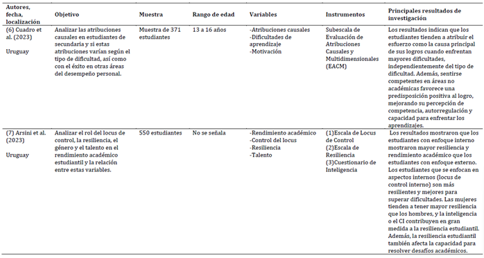 Desde una perspectiva comparada, distintos estudios en América Latina confirman que el locus de control interno se vincula con un mejor rendimiento y adaptación académica. En Chile, Cerda Etchepare et al. (2023) demostraron que los estilos atribucionales internos, específicamente el locus de control, predicen positivamente el rendimiento en matemática; mientras que el locus de control externo de fracaso lo afectan de manera negativa. En esta línea, Vera- Sagredo et al. (2021) y Vera- Sagredo et al. (2024) encontraron asociaciones positivas entre causas internas, autoeficacia y rendimiento percibido, lo que subraya que el locus de control externo vinculado al fracaso se relaciona con menor desempeño y problemas de convivencia escolar, especialmente en estudiantes con necesidades educativas especiales (Vera- Sagredo et al., 2022). En Uruguay, los hallazgos de Cuadro et al. (2023) y Arsini et al. (2023) apuntan a que el esfuerzo y el locus interno no solo potencian el logro académico, sino también la resiliencia, lo que lo convierte en un recurso protector frente a las dificultades.