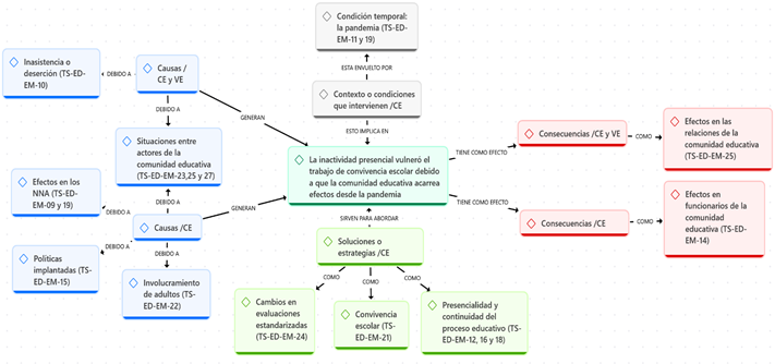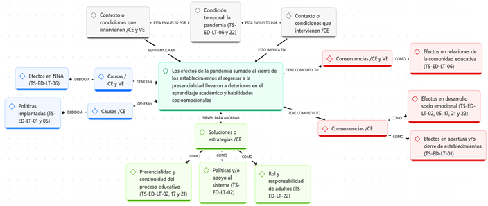 En las editoriales de La Tercera se señala que los efectos de la pandemia, sumados al cierre de los establecimientos al regresar a la presencialidad, llevaron a deterioros en el aprendizaje académico y habilidades socioemocionales. Se describe como contexto principal de este asunto a la pandemia. La situación descrita sirvió como antecedente para identificar las causas de este fenómeno educativo, como los efectos en NNA y las políticas implementadas. Por ejemplo: “La violencia escolar ha aumentado debido al debilitamiento de las relaciones sociales entre alumnos y familiares en pandemia” (TS-LT-06). La situación descrita generó efectos en las relaciones de la comunidad educativa, en el desarrollo emocional y en la apertura o cierre de establecimientos. El medio plantea como solución utilizar estrategias centradas en fomentar la presencialidad y continuidad del proceso educativo, políticas o apoyo al sistema, rol y responsabilidad de adultos, por ejemplo: “Las políticas públicas deben apuntar a la presencialidad porque hay impactos negativos de su ausencia en sus aprendizajes académicos y socioemocionales” (TS-LT-02). En la Figura 2 se presenta la TS general sobre CE del diario La Tercera.