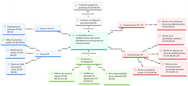 En las editoriales de La Tercera se señala que tras los efectos de la pandemia los establecimientos se han visto envueltos en situaciones de VE que no se han abordado con efectividad debido a la falta de acuerdo y consenso entre las autoridades y las comunidades escolares. Se asocia que el contexto principal de este asunto es la pandemia, y que los actores de la comunidad educativa son una condición interviniente para apoyar el abordaje de la situación de VE. Se señala que la pandemia y las experiencias de los actores dentro de establecimientos sirvieron como antecedentes de algunas de las causas del fenómeno, el involucramiento de adultos, los efectos en NNA, las políticas implementadas, la influencia externa o política, la regulación de sanción y las situaciones entre actores de la comunidad educativa. Por ejemplo: “Existe un aumento de casos de violencia escolar porque hay una naturalización de la violencia en la sociedad” (TS-LT-03). La situación descrita generó efectos en las relaciones de la comunidad educativa y en la asistencia escolar. El medio plantea como solución utilizar estrategias orientadas en el rol y responsabilidad de los adultos y políticas o apoyo al sistema, por ejemplo: “Si existe la situación de violencia escolar, entonces se requieren nuevos recursos de apoyo, porque la raíz de la violencia no está en la escuela” (TS-LT-10). En la Figura 4 se presenta la TS general sobre VE del diario La Tercera.