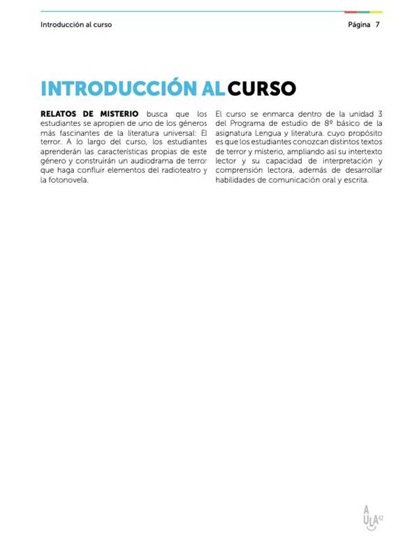 Desde el 2014, la Fundación Consejo de Curso, con sede principal en Chile, viene trabajando en la construcción de una agenda educativa enfocada en hacer de la educación una experiencia divertida y que despierte el gusto por aprender. Esto se ha traducido en el diseño e implementación de programas educativos extracurriculares y escuelas de verano para que los estudiantes chilenos puedan acceder a oportunidades de formación educativa por fuera del horario escolar, en particular aquellos de escasos recursos. Empleando el ABP como la metodología de base, Consejo de Curso ha implementado cerca de 13 cursos tanto a nivel de primaria como de secundaria en varias regiones en Chile. En el 2018, la Fundación expandió sus labores a Colombia e implementó un proyecto piloto en dos colegios de Bogotá. En uno de estos colegios, el profesor de Español y los estudiantes del último grado de secundaria crearon una radionovela para aprender sobre el género del terror y del misterio. En ese sentido, el objetivo de este artículo es socializar la experiencia y evidenciar los beneficios del ABP para incentivar el aprendizaje y el trabajo en equipo.